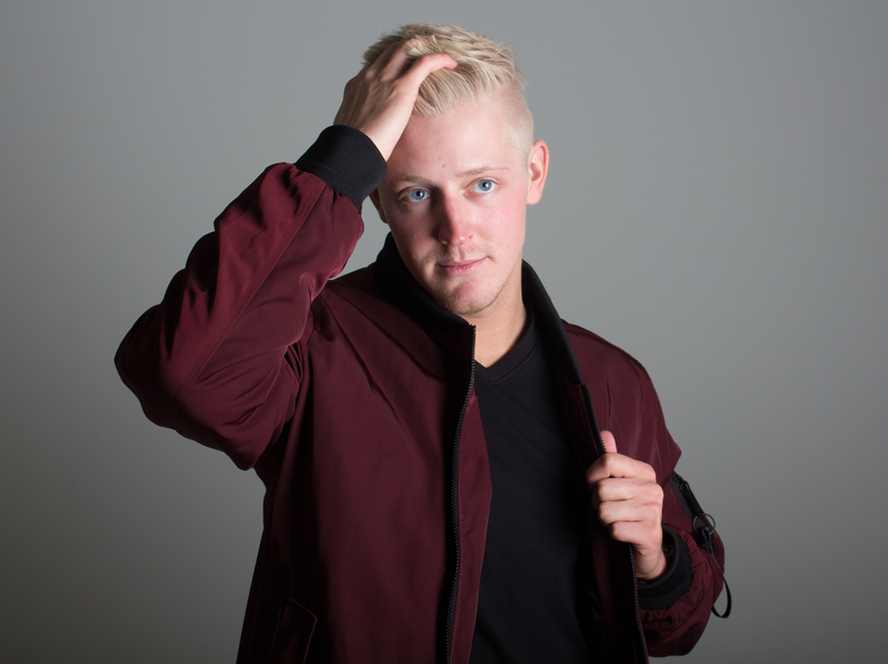 Chandler Karim, wearing Calvin Klein bomber jacket. Shows off one of the hottest new jacket styles, and his personal favorite outer wear.